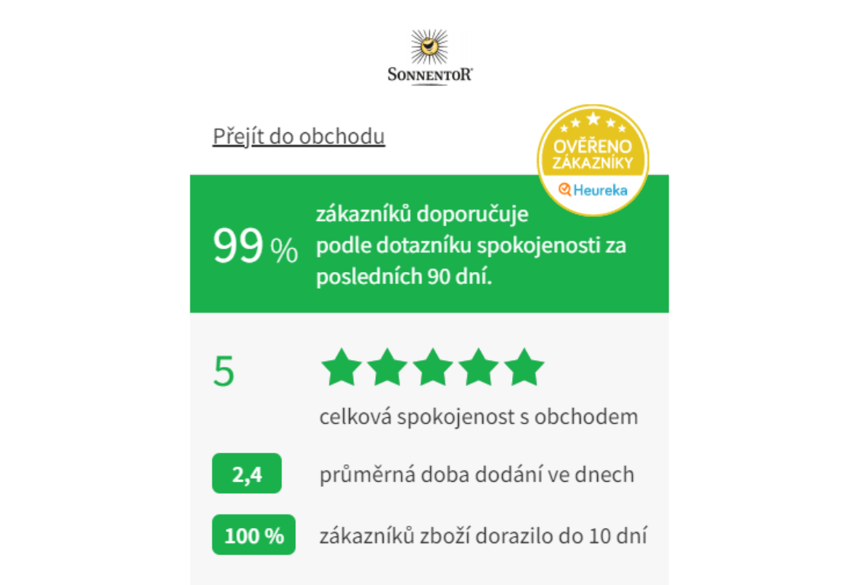 Jsme obchod ověřený těmi nejlepšími inspektory kvality – našimi zákazníky. Podle dotazníku spokojenosti webu Heureka.cz nás za posledních 90 dnů doporučuje 99 % zákazníků. Jsme proto držiteli certifikátu Ověřeno zákazníky.