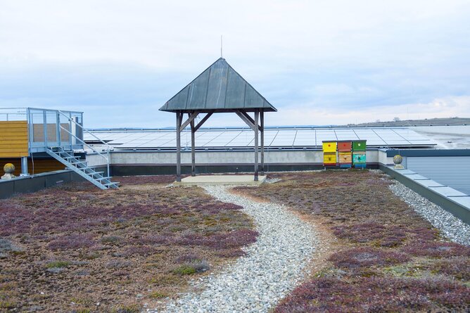Na jedné z našich dvou hal je navíc umístěna zelená střecha. Osázení sukulenty (především netřesky a rozchodníky) zajišťuje optimální mikroklima v prostorech skladů, a to hlavně v létě. Střecha navíc přirozeně zadržuje teplo, a velké plochy tak nesálají do okolí. To je v Čejkovicích jako v jedné z nejteplejších lokalit ČR více než žádoucí. Navíc nám na této „zahradě v oblacích“ bzučí i včelky. Přijďte se podívat, informace o naší Vyhlídce máte tady.