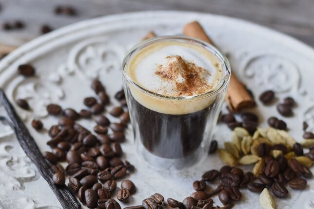 Auf dem Foto sieh man ein Glas mit einem Espresso macchiato darin. Daneben liegen Kaffeebohnen, Zimtstangen und Vanilleschoten. | © SONNENTOR