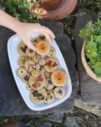 1. Rozehřejte troubu na 180°C. Mezitím rozválejte těsto na válu posypaném moukou. Formičkou vykrájejte sušenky a nazdobte je květy. Použít můžete květy měsíčku, chrpy, sedmikrásky nebo heřmánku.