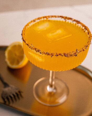 1. Ein schönes Glas vorbereiten - dafür den Glasrand in Zitronensaft tauchen und anschließend in ein wenig Flower Power Gewürz, um einen hübschen Gewürzrand zu bekommen.