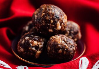 Auf dem Foto ist eine Schale mit Stollenbällchen zu sehen. Die Schale steht auf einem roten Tuch. | © SONNENTOR