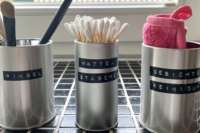 Auf dem Foto sieht man drei Gefäße zur Aufbewahrung im Bad. Darin sind Pinsel, Wattestäbchen und  ein Lappen zu sehen. | © SONNENTOR